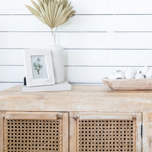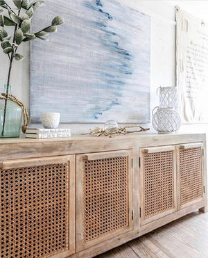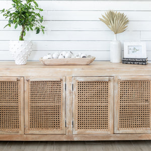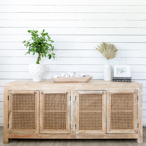 Made from mango wood and cane this piece holds a multitude of storage options. One stationary shelf on both sides. Perfect piece for a media console, entry table, sofa table, sideboard, console.