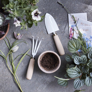 The palm-sized garden trowel and cultivator are a durable duo perfect for tending to an apartment garden, houseplants, and planting and transplanting seedlings. A great size for little green thumbs too. Both tools are hand-crafted, using Japanese sustainable beech wood for the handles and Japanese stainless steel blacksmith heat treatments and techniques.