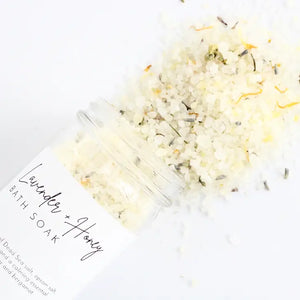 Dead Sea Salt, Epsom Salt, Oat Flour, Tapioca Starch, Honey Powder, Organic Dried Lavender Buds, Organic Dried Chamomile Flowers, Dried Calendula Petals, Lavender Essential Oil, Bergamot Essential Oil