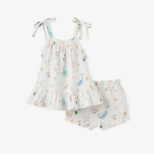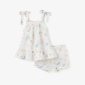 Good for baby, good for the environment. Our organic, naturally sustainable muslin is soft and breathable, ideal for outdoor adventures during the spring and summertime. Cast in a dreamy palette, this muslin tie top dress set combines fashion and function for the modern child.