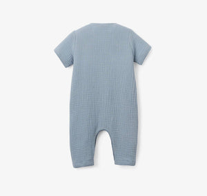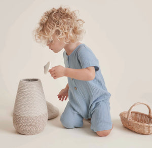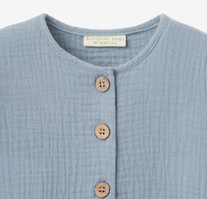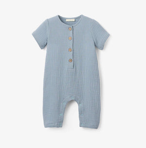 Good for baby, good for the environment. Organic, naturally sustainable muslin is soft and breathable, ideal for outdoor adventures during the spring and summertime. Cast in a dreamy palette, this muslin baby jumpsuit combines fashion and function for the modern child. Wooden buttons and a henley collar add an extra dash of style to this already stunning muslin baby jumpsuit.